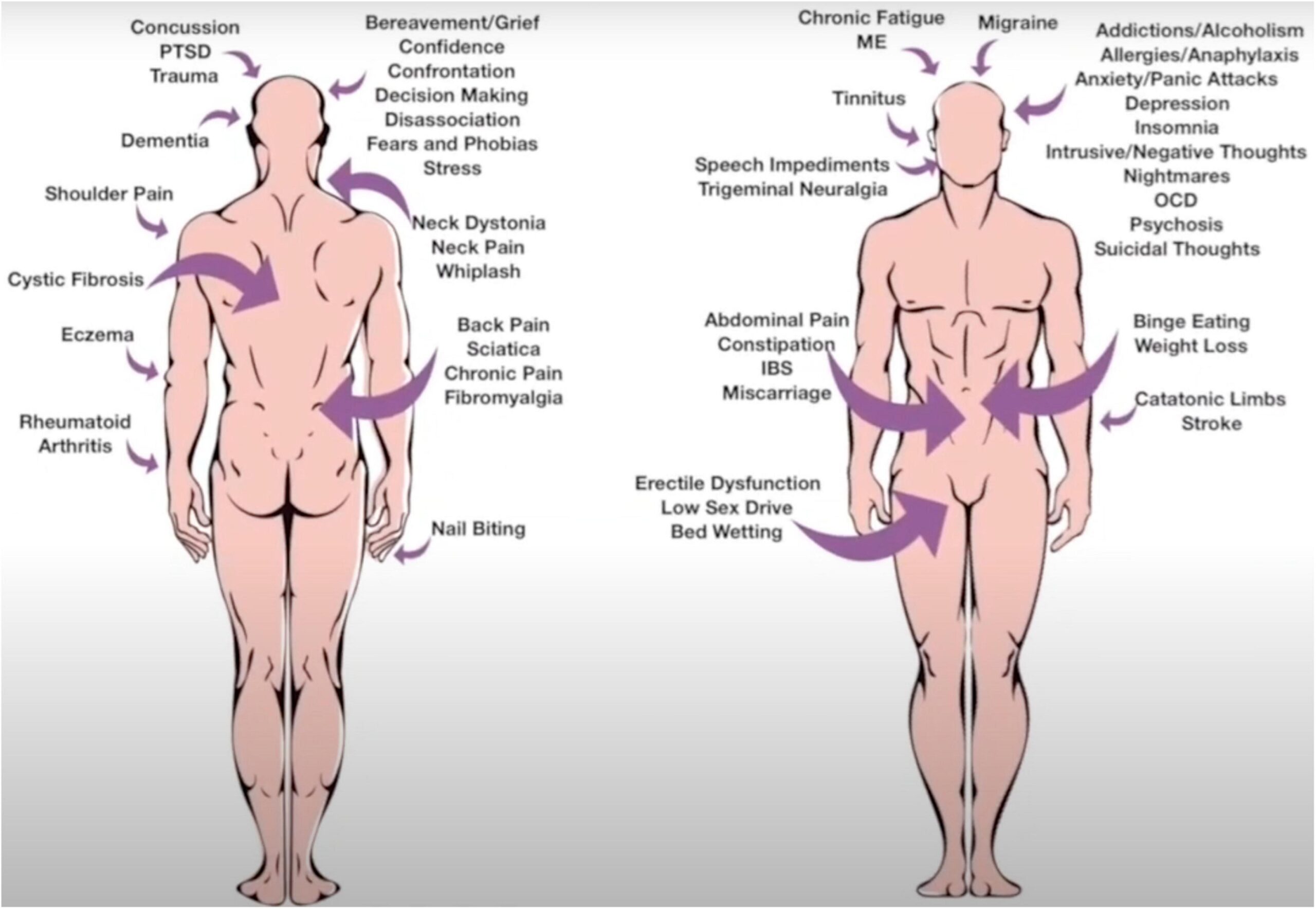 Following a traumatic event, an “emotional memory image” (EMI) is retained (Bernheim, 2018) and becomes part of a subconscious “danger list” (Lang, 1979; see Ji et al., 2016) for review. External inputs, via any of the senses, that are symbolic of or similar to the original experience, can invoke a specific EMI, triggering the body’s learned stress response. Key to understanding this model is recognizing that the physical response might not be as strong as it was the first time round and might not even be consciously recognized as a response (we learn to ignore involuntary physical reactions, such as ticks, if they happen frequently enough). The cumulative effect of frequently triggered low-key “fight or flight” responses causes a great deal of physical stress, which we propose is enough to underpin a wide range of negative health conditions. These are explored briefly in “Discussion” section.