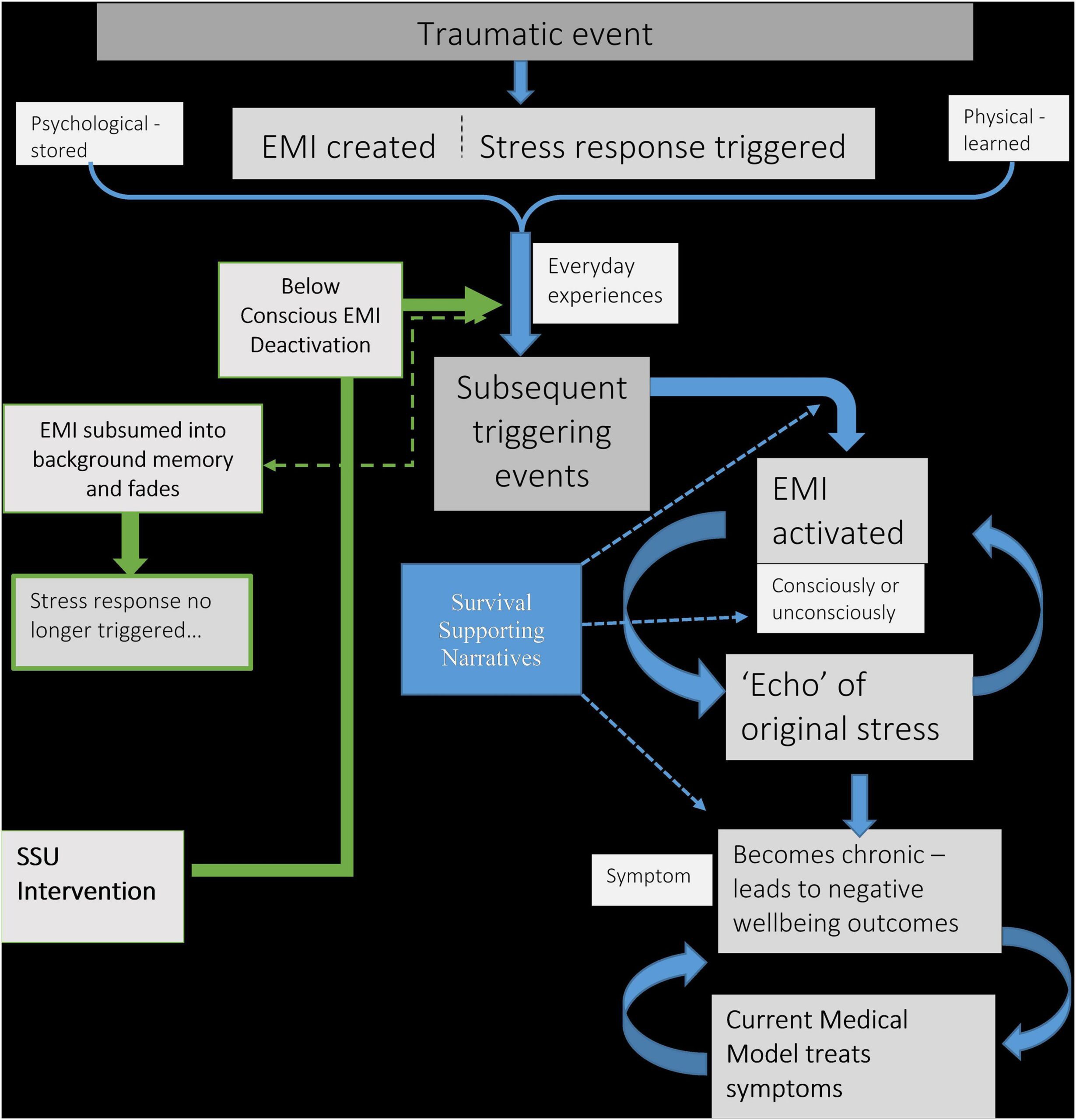 Figure 1. Schematic diagram explaining the connection between traumatic events and chronic negative wellbeing. Also includes proposed intervention. EMI, Emotional Memory Image; SSU, split-second unlearning.